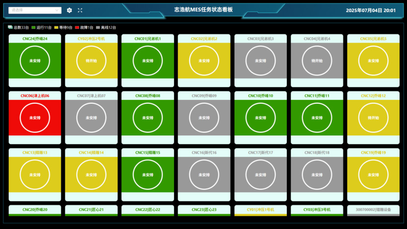動態(tài)監(jiān)控機臺運行狀態(tài)(待機/運行/故障),同步關(guān)聯(lián)生產(chǎn)工單信息,實時可視化展示工序級任務(wù)進度百分比與剩余工時