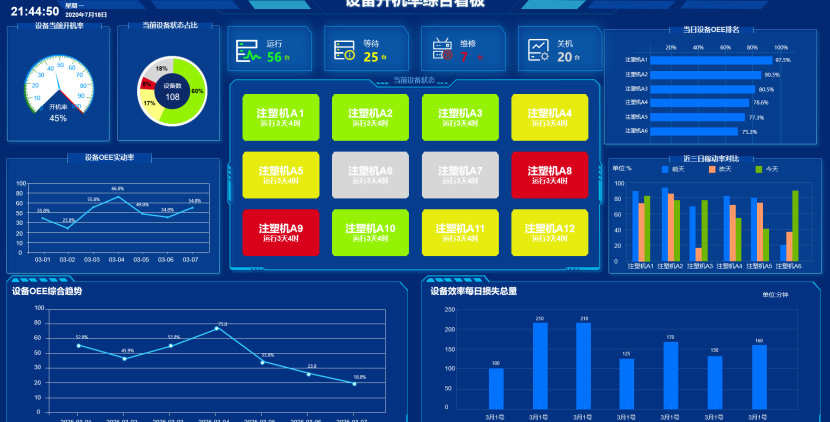 設(shè)備綜合看板集成展示:實(shí)時(shí)設(shè)備狀態(tài)、OEE綜合效率(含實(shí)動(dòng)率及趨勢(shì)分析)、每日效率損失統(tǒng)計(jì)、當(dāng)日OEE排名及近三日稼動(dòng)率對(duì)比數(shù)據(jù)。