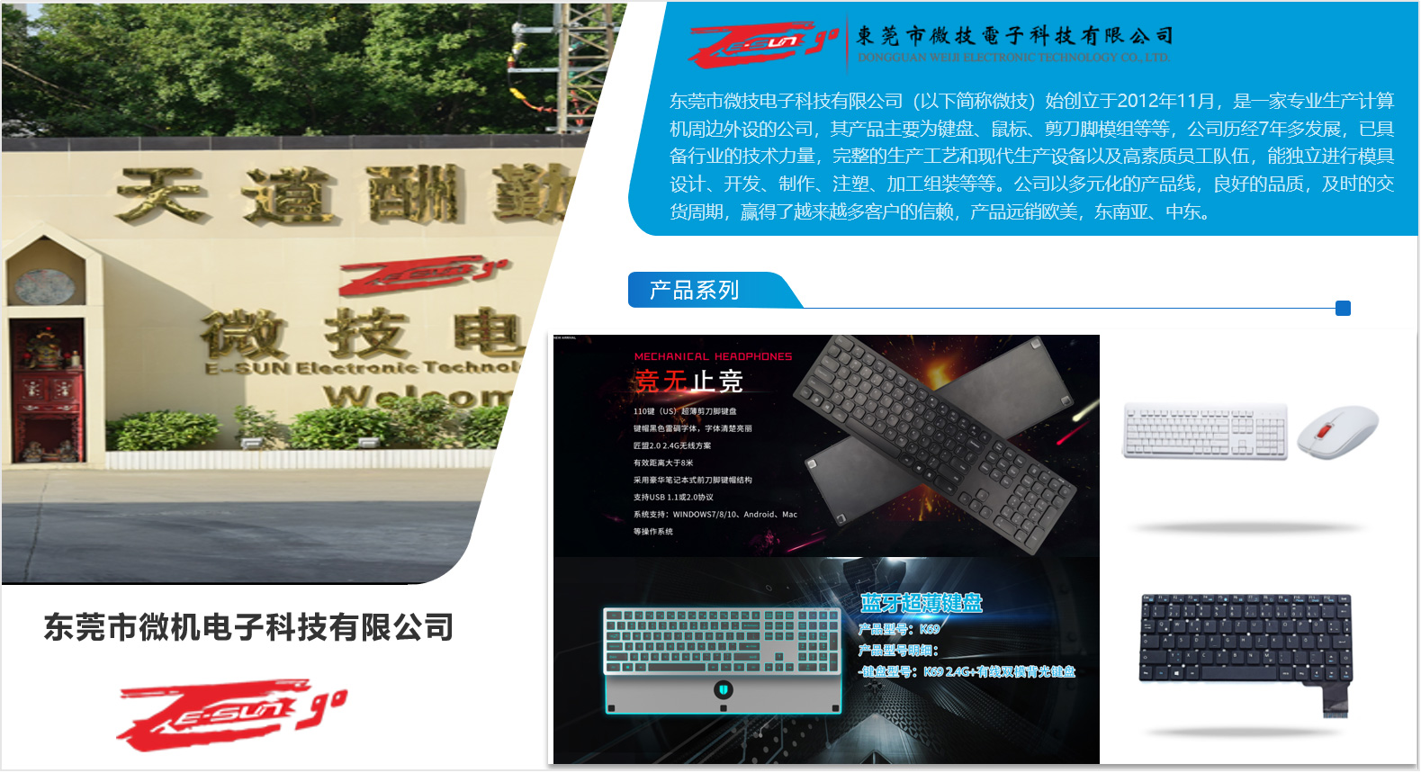 以前瞻視覺(jué) 發(fā)現(xiàn)并布局未來(lái)東莞市微技電子科技有限公司(以下簡(jiǎn)稱微技)始創(chuàng)立于2012年11月,是一家專業(yè)生產(chǎn)計(jì)算機(jī)周邊外設(shè)的公司,其產(chǎn)品主要為鍵盤、鼠標(biāo)、剪刀腳模組等等,公司歷經(jīng)7年多發(fā)展,已具備行業(yè)的技術(shù)力量,完整的生產(chǎn)工藝和現(xiàn)代生產(chǎn)設(shè)備以及高素質(zhì)員工隊(duì)伍,能獨(dú)立進(jìn)行模具設(shè)計(jì)、開(kāi)發(fā)、制作、注塑、加工組裝等等。公司產(chǎn)品款式豐富,兼容高、中、低檔次,月生產(chǎn)能力達(dá)50至60萬(wàn)只。公司以多元化的產(chǎn)品線,良好的品質(zhì),及時(shí)的交貨周期,贏得了越來(lái)越多客戶的信賴,產(chǎn)品遠(yuǎn)銷歐美,東南亞、中東。