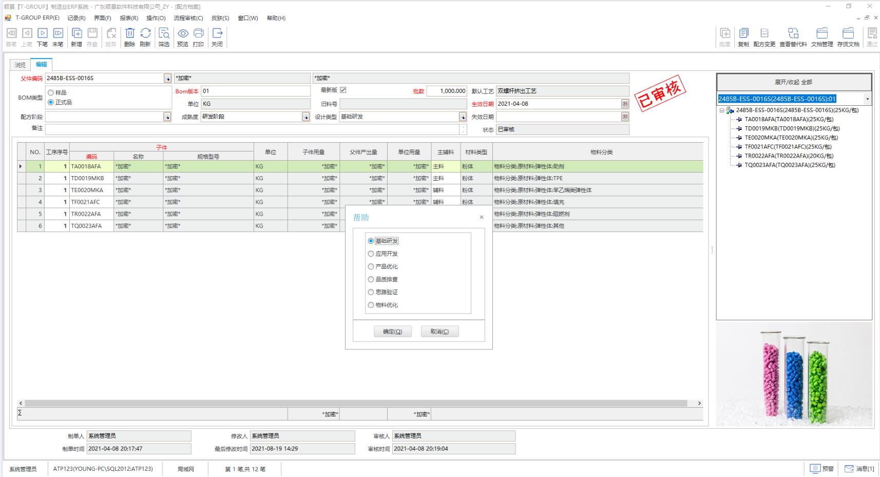 順景S9 ERP對(duì)于改性塑料工廠的配方研發(fā)過(guò)程進(jìn)行了全程管理,從發(fā)起配方,到參與實(shí)驗(yàn)的配方,配方輪次、優(yōu)選配方、終審配方,以及制樣工藝、試片工藝、測(cè)試套餐,都進(jìn)行了記錄和管理,這為研發(fā)部門(mén)提供了詳盡的研發(fā)履歷查詢,并累積形成研發(fā)配方庫(kù)、生產(chǎn)工藝庫(kù)。