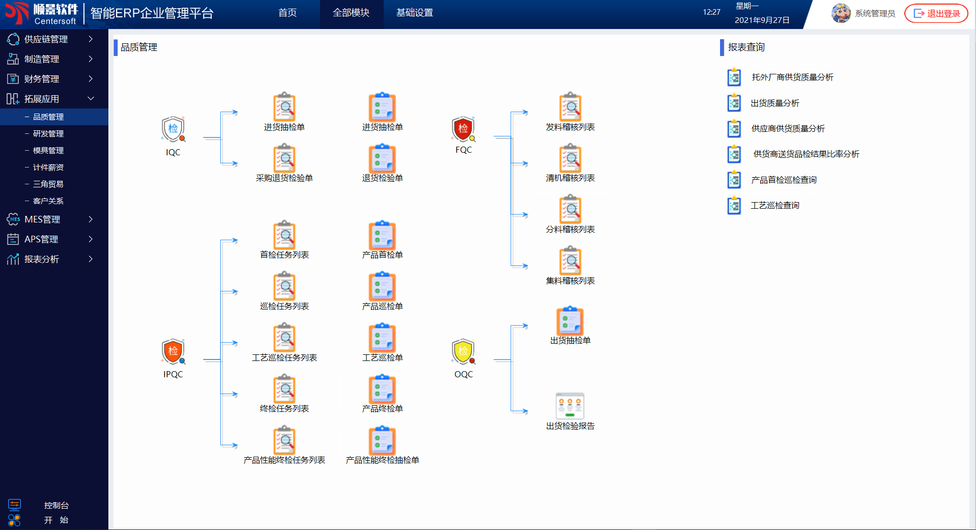 品質(zhì)及生產(chǎn)過(guò)程監(jiān)控,是順景S9 ERP另一管控重點(diǎn);IQC來(lái)料檢驗(yàn),會(huì)由系統(tǒng)生成質(zhì)檢工令單進(jìn)行材料檢驗(yàn),材料從倉(cāng)庫(kù)到配料房到攪拌、擠出的每一過(guò)程及位置移動(dòng),IPQC都會(huì)有稽核任務(wù)并回報(bào)稽核結(jié)果是否有異常,生產(chǎn)首檢、巡檢、工藝巡檢、產(chǎn)品性能終檢都在系統(tǒng)中進(jìn)行記錄和監(jiān)控,出貨后也有出貨檢驗(yàn)報(bào)告生成。