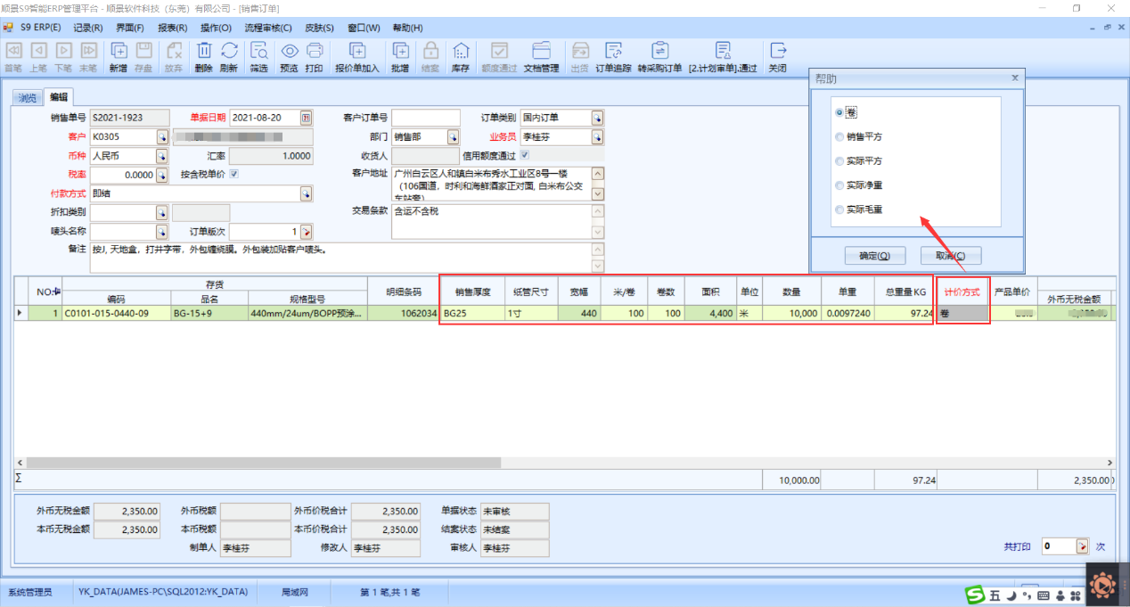 那針對(duì)業(yè)務(wù)下單這塊單位不一致的問題,順景ERP系統(tǒng)針對(duì)模切行業(yè)的應(yīng)用特點(diǎn),在銷售模塊針對(duì)性的做了一些定制開發(fā),如新增一個(gè)計(jì)價(jià)方式、產(chǎn)品單價(jià)、卷數(shù)、米/卷等欄位,客戶根據(jù)不同的計(jì)價(jià)方式填寫不同的產(chǎn)品單價(jià),系統(tǒng)會(huì)算出相應(yīng)的總金額。比如,當(dāng)計(jì)價(jià)方式選擇為卷時(shí),系統(tǒng)計(jì)算總金額的公式為產(chǎn)品單價(jià)*卷數(shù),當(dāng)計(jì)價(jià)方式為實(shí)際平方時(shí),系統(tǒng)計(jì)算總金額的方式為產(chǎn)品單價(jià)*面積,當(dāng)計(jì)價(jià)方式為實(shí)際毛重時(shí),系統(tǒng)計(jì)算總金額的方式為產(chǎn)品單價(jià)*總重量欄位,且總金額欄位計(jì)算后系統(tǒng)會(huì)自動(dòng)算出產(chǎn)品米數(shù),并反算系統(tǒng)每米的單價(jià)。