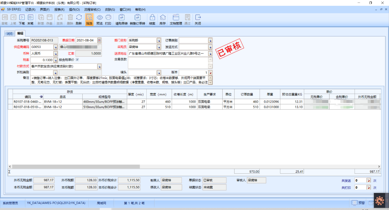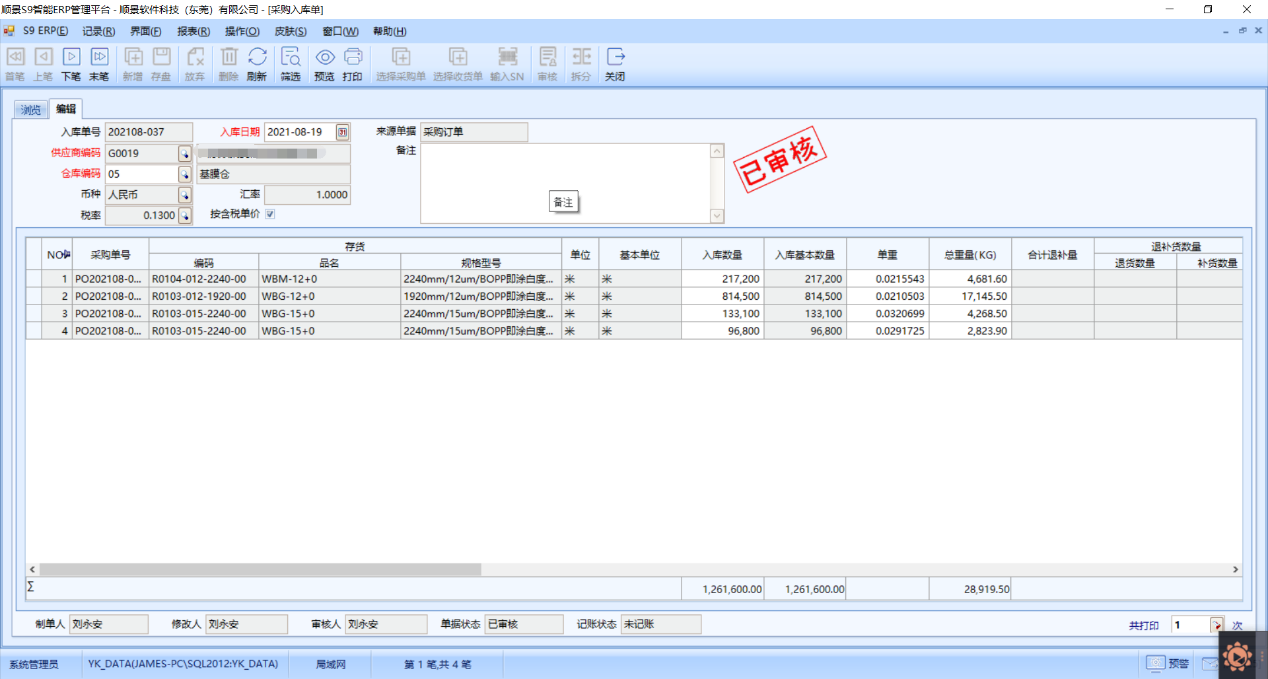 采購在接收到PMC請(qǐng)購需求時(shí),可以把對(duì)應(yīng)客戶要求,關(guān)聯(lián)至采購訂單,并且采購明細(xì)有厚度、寬度、收卷長度、生產(chǎn)要求欄位指定,方便采購與計(jì)劃以及銷售的信息協(xié)同,倉庫入庫時(shí)多單位計(jì)量,系統(tǒng)不僅記錄基本采購單位,還顯示物料單重以及入庫總重量。