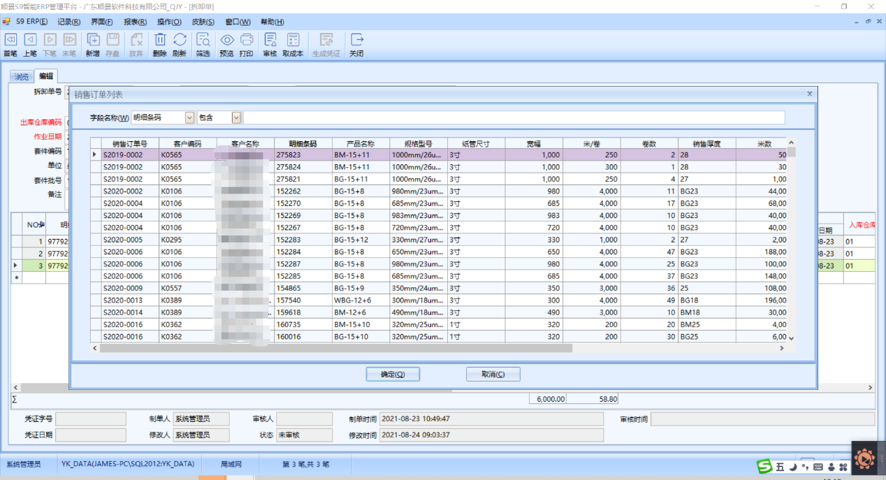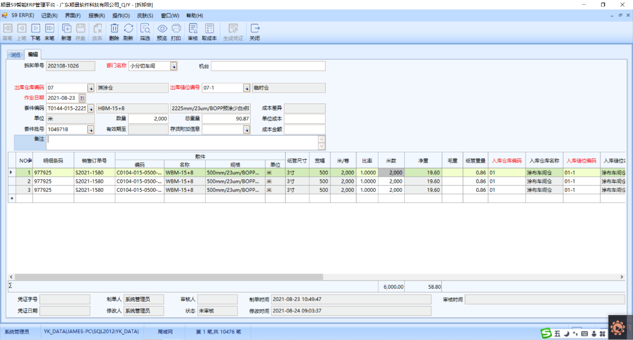 分切車間通過掃碼的方式完成分切單據(jù)的錄入,PMC首先會(huì)根據(jù)明天要做的銷售訂單產(chǎn)品,打印銷售訂單,并附帶銷售訂單的訂單條碼,下發(fā)給分切車間機(jī)臺(tái)的機(jī)長,機(jī)長通過拆卸單界面用掃碼槍掃描條碼的方式進(jìn)行涂布母卷的分切。首先掃描涂布母卷標(biāo)簽上的料號(hào)二維碼,再掃描標(biāo)簽上的批號(hào)二維碼,系統(tǒng)會(huì)自動(dòng)匹配涂布母卷的信息,自動(dòng)帶出該母卷的倉庫儲(chǔ)位及米數(shù)等信息。成品分切后,機(jī)長會(huì)在拆卸單子表訂單條碼欄位掃描訂單條碼,確定分切的是哪張銷售訂單的產(chǎn)品,掃描訂單條碼后,系統(tǒng)會(huì)自動(dòng)匹配銷售訂單的信息,并自動(dòng)生成成品的批次號(hào),機(jī)長每分切完一卷都會(huì)修改填寫該卷膜的實(shí)際重量及米數(shù),下卷膜分切完后會(huì)重復(fù)此操作,分切完后也會(huì)貼上成品膜標(biāo)簽。