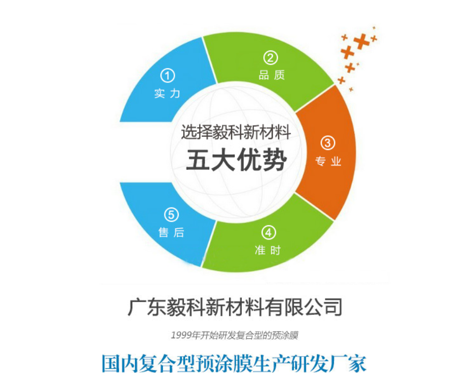 廣東毅科新材料有限公司從1999年開始研發(fā)復(fù)合型的預(yù)涂膜,也是國內(nèi)復(fù)合型預(yù)涂膜生產(chǎn)研發(fā)廠家,十幾年來我們不斷努力改進產(chǎn)品,優(yōu)化產(chǎn)品性能,制造多元化復(fù)合材料產(chǎn)品。公司主營產(chǎn)品BOPP預(yù)涂膜、PET預(yù)涂膜、數(shù)碼印刷預(yù)涂膜 ,廣告噴繪熱裱膜,PET地暖復(fù)合材料,產(chǎn)品應(yīng)用于包裝印刷覆膜、辦公用品覆膜,廣告熱裱覆膜、建筑復(fù)合材料、光學(xué)復(fù)合材料等領(lǐng)域 。公司已通過ISO09001:2008質(zhì)量管理體系認(rèn)證、綠色印刷環(huán)保標(biāo)志認(rèn)證、國家高新技術(shù)企業(yè)認(rèn)定;EVA型預(yù)涂膜行業(yè)標(biāo)準(zhǔn)制定單位等榮譽,先進的ERP系統(tǒng)管理,注重知識產(chǎn)權(quán)的開發(fā)和應(yīng)用,授權(quán)實用新型專利有多項,申請發(fā)明專利多項;還擁有一支優(yōu)秀的研發(fā)團隊,專業(yè)知識和技術(shù)經(jīng)驗豐富,能為產(chǎn)品的質(zhì)量提供強而有力的技術(shù)支撐。有良好的企業(yè)氛圍和濃厚的企業(yè)文化,我司運用5S的管理營造一目了然的工作環(huán)境,養(yǎng)成良好的工作習(xí)慣,提升員工水平,一起營造一個和諧美好的工作環(huán)境,從而達到規(guī)范化管理。 感恩,價值,共進,分享是我們的理念,“雙贏”是我們的經(jīng)營方針,我們將進一步完善企業(yè)質(zhì)量管理體制,為客戶提供更優(yōu)質(zhì)的產(chǎn)品和服務(wù)。